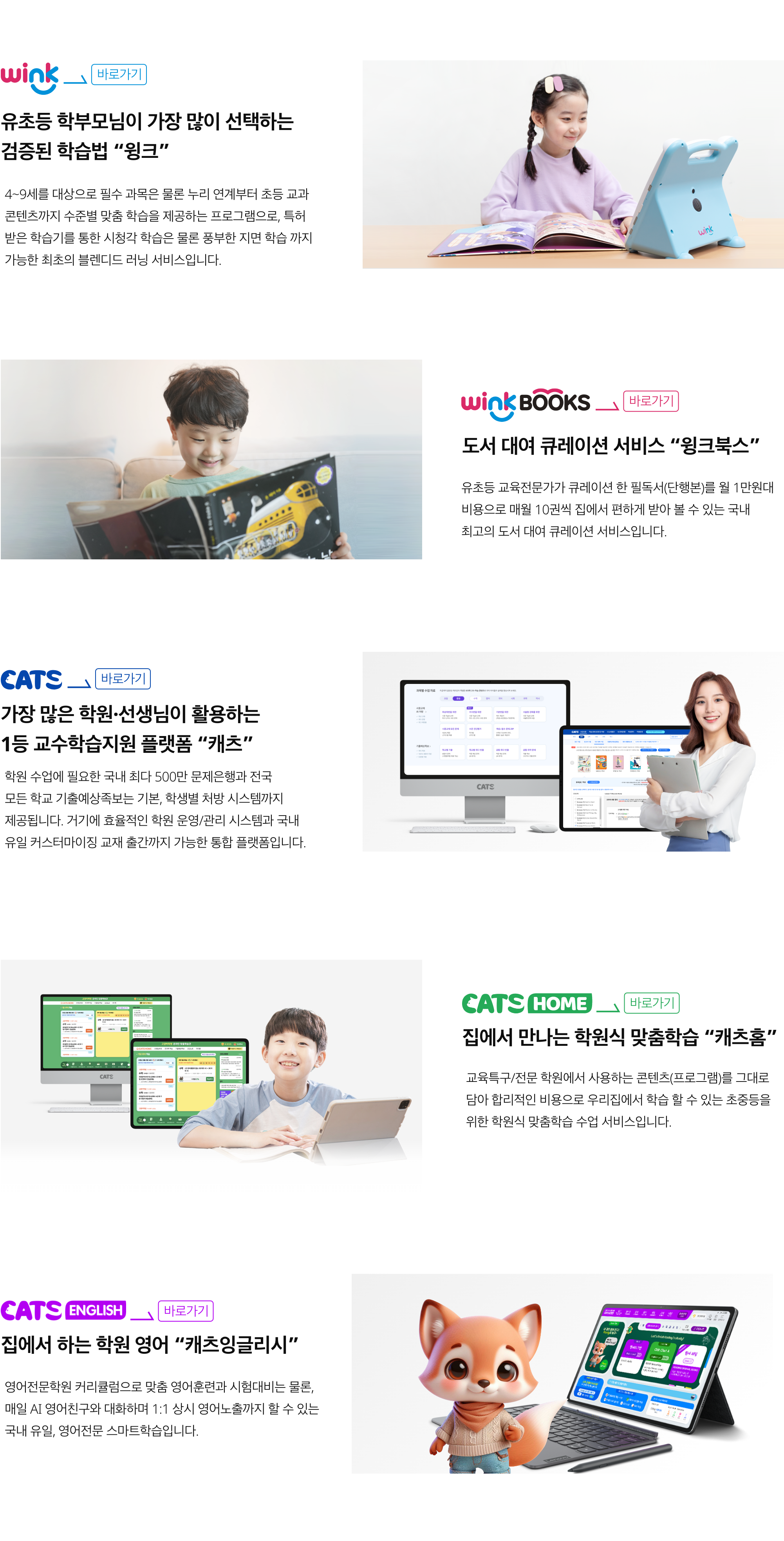 이러한 성공 경험과 콘텐츠 자산을 바탕으로 학원 선생님의 수업준비 시간을 단축시켜 줄 통합 플랫폼 "캐츠"와 집에서 학원식 맞춤학습을 할 수 있는 "캐츠홈"까지 론칭했습니다.